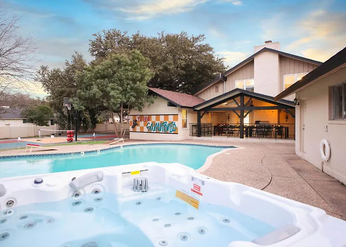 Experience an exquisite retreat at the Sleeps 16 Private Pool Sport Court Hot Tub Arcade Villa, a luxurious haven designed for family and friends seeking unparalleled relaxation and fun. Nestled in the vibrant city of San Antonio, this stunning villa is just a short drive from the bustling downtown area and its myriad of attractions. Only 10 kilometers from San Antonio International Airport, guests will find this location both accessible and conveniently situated for exploring the local culture.